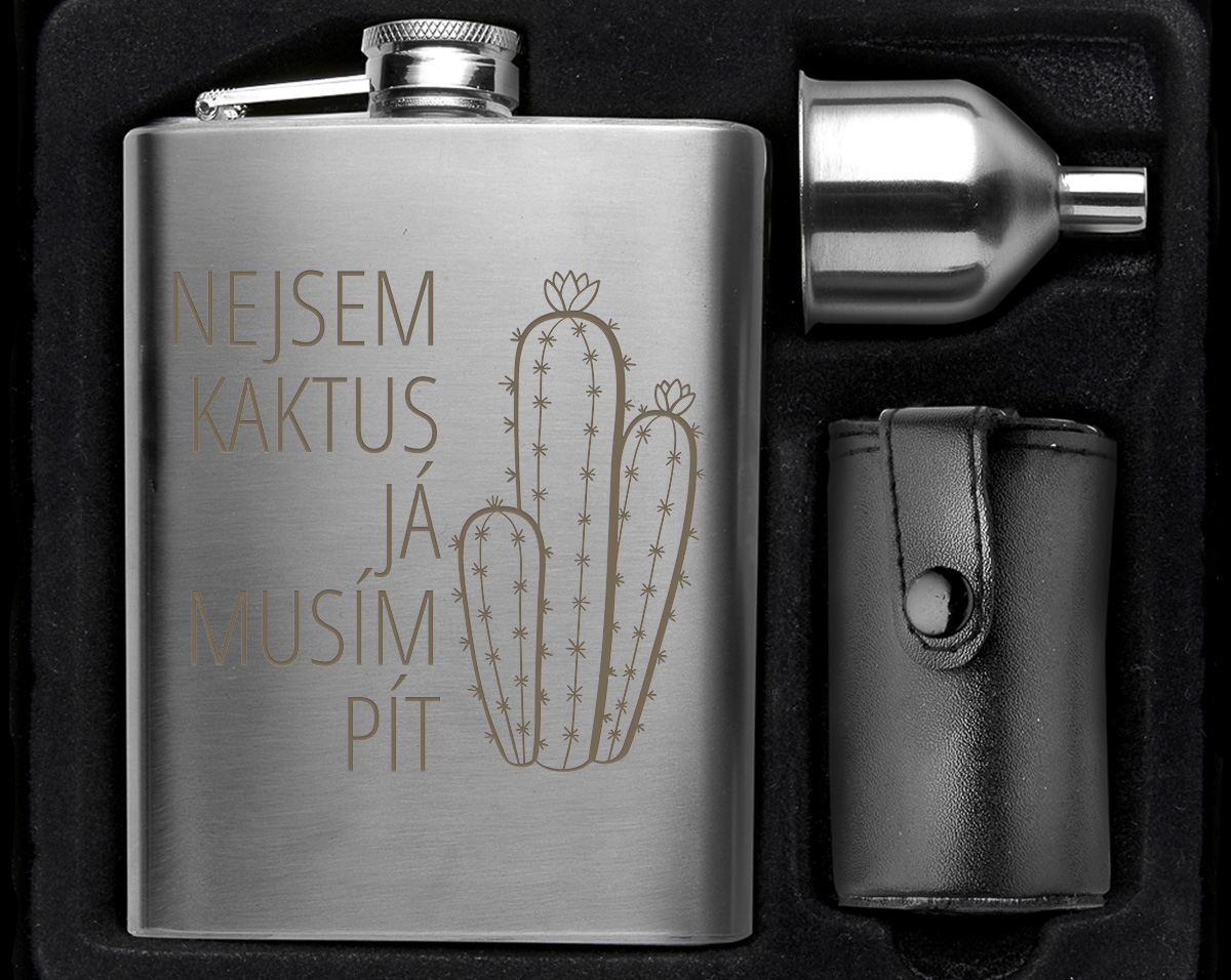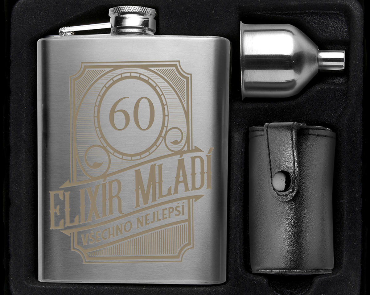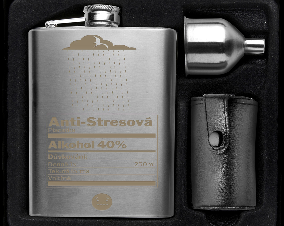 Vreckový likérka s objemom 220 ml, 4 poháriky (30 ml), a lievika. Balené v darčekovej krabičke.